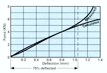 The example illustrated above is typical of most disc springs, and underlines the necessity of limiting maximum deflection to 75% to avoid sharply increasing force and stress characteristics.